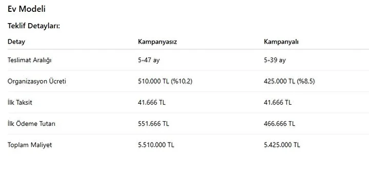 Kampanyalı seçenekte ise teslimat süresi 5 ila 39 ay arasında değişiyor. Organizasyon ücreti yüzde 8,5 olarak belirleniyor, bu da 425 bin liraya denk geliyor. İlk ödeme 466 bin 666 lira olurken, başlangıç taksiti yine 41 bin 666 lira oluyor. 70. ayda taksit 109 bin 679 liraya yükseliyor, 71. ayda ise son taksit 16 bin 950 lira ile ödeme tamamlanıyor. Tahsilatlar her ayın 20’si ile 30’u arasında gerçekleştiriliyor.
